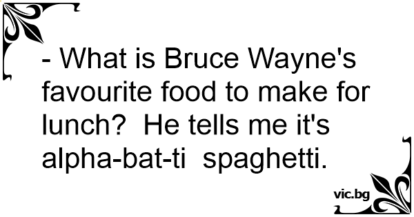 - What is Bruce Wayne's favourite food to make for lunch? He tells me it's alpha-bat-ti spaghetti.