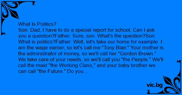 Son: Dad, I have to do a special report for school. Can I ask you a question?Father: Sure, son. What's the question?Son: What is politics?Father: Well, let's take our home for example. I am the wage earner, so let's call me "Tony Blair." Your mother is the administrator of money, so we'll call her "Gordon Brown." We take care of your needs, so we'll call you "the People." We'll call the maid "the Working Class," and your baby brother we can call "the Future." Do you understand, son?Son: I'm not really sure, Dad. I'll have to think about it.That night, awakened by his baby brother's crying, the boy went to see what was wrong. Discovering that the baby had seriously soiled his diaper, the boy went to his parents' room and found his mother sound asleep. He went to the maid's room where, peeking through the keyhole, he saw his father in bed with the maid. The boy's knocking went totally unheeded by his father and the maid, so the boy returned to his room and went back to sleep. The next morning he reported to his father.Son: Dad, now I think I understand what politics is.Father: Good, son! Can you explain it to me in your own words? Son: Well, dad, while Tony Blair is sсrеwing the Working Class, Gordon Brown is sound asleep, the People are being completely ignored and the Future is full of s**t.