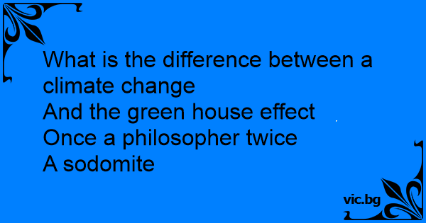What is the difference between a climate change<br />And the green house effect<br />Once a philosopher twice<br />A sodomite