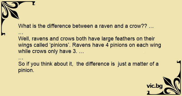 Well, ravens and crows both have large feathers on their wings called ‘pinions’. Ravens have 4 pinions on each wing while crows only have 3. …