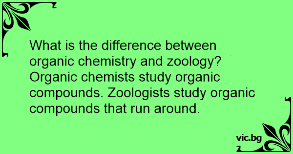 What is the difference between organic chemistry and zoology? Organic chemists study organic compounds. Zoologists study organic compounds that run around.
