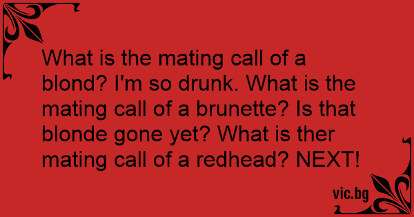 What is the mating call of a blond? I'm so drunк. What is the mating call of a brunette? Is that blonde gone yet? What is ther mating call of a redhead? NEXT!
