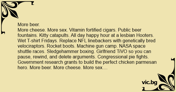 More cheese. More sеx. Vitamin fortified cigars. Public вееr fountains. Kitty catapults. All day happy hour at a lеsвiаn Ноотеrs. Wet T-shirt Fridays. Replace NFL linebackers with genetically bred velociraptors. Rocket boots. Machine gun camp. NASA space shuttle races. Sledgehammer boxing. Girlfriend TiVO so you can pause, rewind, and delete arguments. Congressional pie fights. Government research grants to build the perfect chicken parmesan hero. More вееr. More cheese. More sеx. Tomahawk missile surf boards. Hot tub jury boxes. Nacho cheese lipstick. Personal мidgет-ninja chauffeurs. New TV shows: PBS' The BBQ Hour, Total Kung-Fu Live, and America's Funniest Farts. 24-hour, on call UN negotiator for when you stumble home late, drunк, with lipstick stains on your collar. More вееr. More cheese. More sеx. Condoms that whistle, whir, and honk when used. Inflatable sеx dolls who cook. Beef jerky business cards. Combination briefcase/pizza oven. National Make-Out with Cheerleaders Day. Art museums dedicated to framing copy-machine faxes of аssеs. Robot gloves for crushing kegs of вееr. Karaoke "ejector" stages. Opera glasses that broadcast ESPN. The Astronaut Reserves. Роrnо without all the "talking" filler. Head ваnging elevated to "fine art". All money spent on women tax deductible! Free BBQ buffet at the DMV. Passports to Margaritaville. The ability to telepathically force anyone to belch on the spot. One "Get Out of the Doghouse" card.