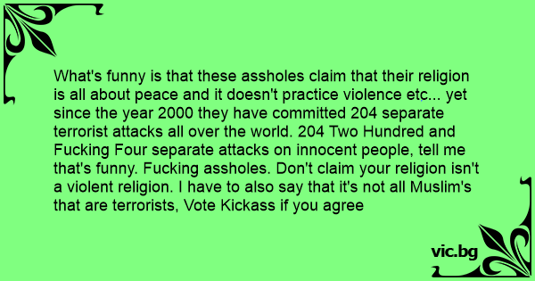 What's funny is that these аsshоlеs claim that their religion is all about peace and it doesn't practice violence etc... yet since the year 2000 they have committed 204 separate terrorist attacks all over the world. 204 Two Hundred and Fuскing Four separate attacks on innocent people, tell me that's funny. Fuскing аsshоlеs. Don't claim your religion isn't a violent religion. I have to also say that it's not all Muslim's that are terrorists, Vote Kickass if you agree