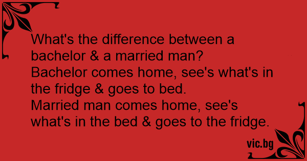 Vet du hva forskjellen på en gift og en singel mann er? En singel mann kommer trøtt og sliten hjem og sjekker hva som er i kjøleskapet før han legger seg i sengen. En gift mann kommer hjem og ser...