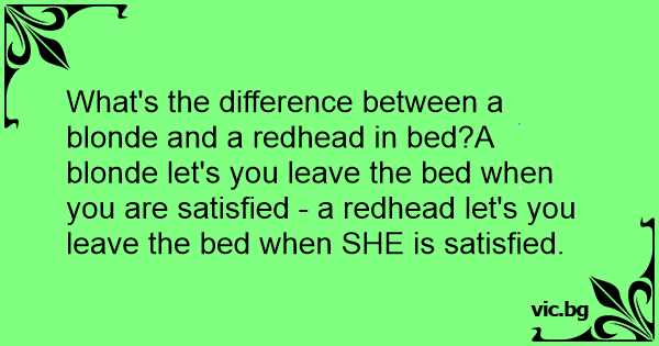 What's the difference between a blonde and a redhead in bed?A blonde let's you leave the bed when you are satisfied - a redhead let's you leave the bed when SHE is satisfied.