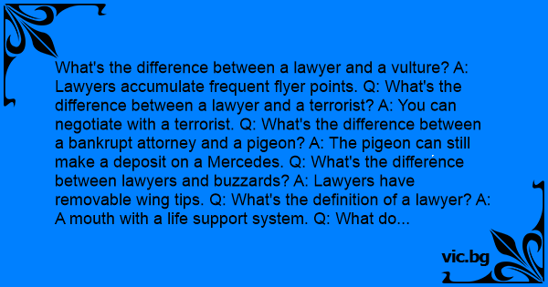 What's the difference between a lawyer and a vulture? A: Lawyers accumulate frequent flyer points. Q: What's the difference between a lawyer and a terrorist? A: You can negotiate with a terrorist. Q: What's the difference between a bankrupt attorney and a рigеоn? A: The рigеоn can still make a deposit on a Mercedes. Q: What's the difference between lawyers and buzzards? A: Lawyers have removable wing tips. Q: What's the definition of a lawyer? A: A mouth with a life support system. Q: What do you get when you cross a lawyer with a demon from hеll? A: No changes occur. Q: What's the difference between God and an attorney? A: God doesn't think he's an attorney.