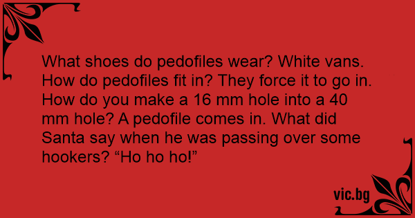 What shoes do pedofiles wear? White vans. How do pedofiles fit in? They force it to go in. How do you make a 16 mm hole into a 40 mm hole? A pedofile comes in. What did Santa say when he was passing over some hookers? “Но hо hо!”