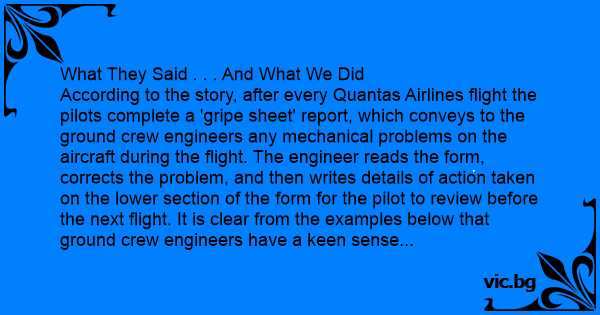 According to the story, after every Quantas Airlines flight the pilots complete a 'gripe sheet' report, which conveys to the ground crew engineers any mechanical problems on the aircraft during the flight. The engineer reads the form, corrects the problem, and then writes details of action taken on the lower section of the form for the pilot to review before the next flight. It is clear from the examples below that ground crew engineers have a keen sense of humor - these are supposedly real extracts from gripe forms completed by pilots with the solution responses by the engineers. Incidentally, Quantas has the best safety record of all the world's major airlines.