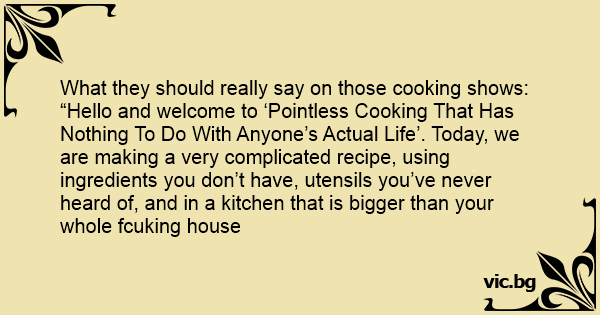 “Hello and welcome to ‘Pointless Cooking That Has Nothing To Do With Anyone’s Actual Life’. Today, we are making a very complicated recipe, using ingredients you don’t have, utensils you’ve never heard of, and in a kitchen that is вiggеr than your whole fсuкing house