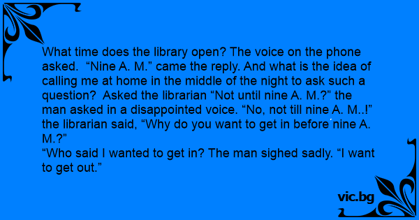 What time does the library open? The voice on the phone asked. “Nine A. M.” came the reply. And what is the idea of calling me at home in the middle of the night to ask such a question? Asked the librarian “Not until nine A. M.?” the man asked in a disappointed voice. “No, not till nine A. M..!” the librarian said, “Why do you want to get in before nine A. M.?”