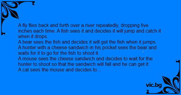 So, the fly drops, the fish jumps, the bear goes for it, the hunter shoots, the sandwich falls, the mouse goes for it, and the cat jumps, but he misses and goes into the water.