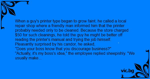 When a guy's printer type began to grow faint, he called a local repair shop where a friendly man informed him that the printer probably needed only to be cleaned. Because the store charged $50 for such cleanings, he told the guy he might be better off reading the printer's manual and trying the job himself.