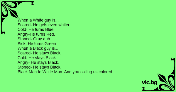 En färgad man går in på en bar. En vit man säger: - Färgade är inte tillåtna här. Den färgade manen säger: - När jag föds är jag svart; när jag fryser är jag svart; när jag är sjuk är jag...