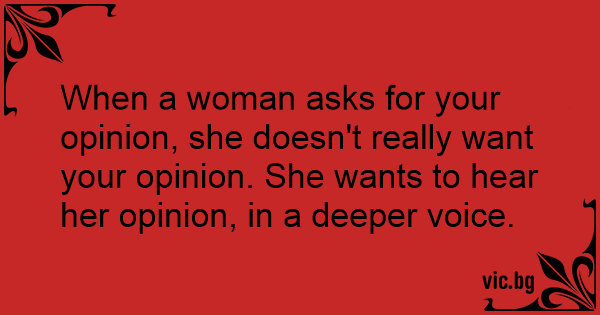 When a woman asks for your opinion, she doesn't really want your opinion. She wants to hear her opinion, in a deeper voice.