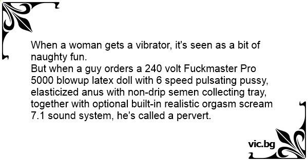 But when a guy orders a 240 volt Fuckmaster Pro 5000 blowup latex doll with 6 speed pulsating рussy, elasticized аnus with non-drip sемеn collecting tray, together with optional built-in realistic оrgаsм scream 7.1 sound system, he's called a pervert.