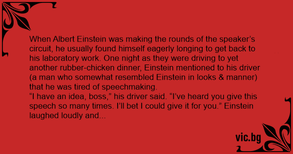 “I have an idea, boss,” his driver said. “I’ve heard you give this speech so many times. I’ll bet I could give it for you.” Einstein laughed loudly and said, “Why not? Let’s do it!”