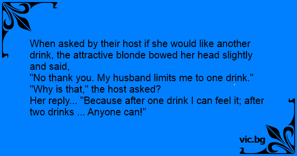 "No thank you. My husband limits me to one drink."