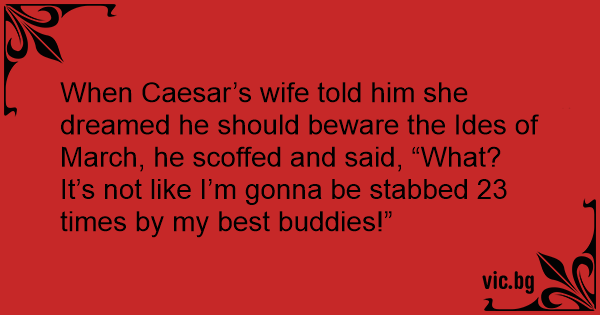 When Caesar’s wife told him she dreamed he should beware the Ides of March, he scoffed and said, “What? It’s not like I’m gonna be stabbed 23 times by my best buddies!”