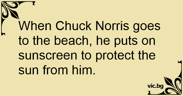 When Chuck Norris goes to the beach, he puts on sunscreen to protect the sun from him. 27 0 0 Chuck Norris Jokes