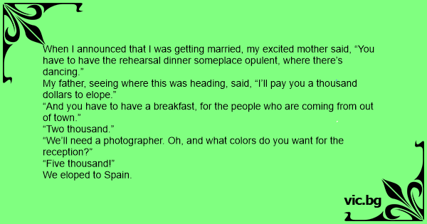 My father, seeing where this was heading, said, “I’ll pay you a thousand dollars to elope.”
