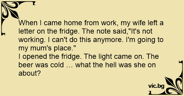 When I came home from work, my wife left a letter on the fridge. The note said,"It's not working. I can't do this anymore. I'm going to my mum's place."