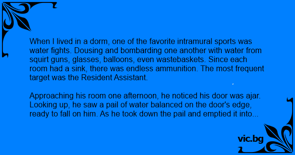 When I lived in a dorm, one of the favorite intramural sports was water fights. Dousing and bombarding one another with water from squirt guns, glasses, balloons, even wastebaskets. Since each room had a sink, there was endless ammunition. The most frequent target was the Resident Assistant.