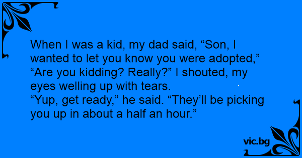 When I was a kid, my dad said, “Son, I wanted to let you know you were adopted,” “Are you kidding? Really?” I shouted, my eyes welling up with tears. “Yup, get ready,” he said. “They’ll be picking you up in about a half an hour.”