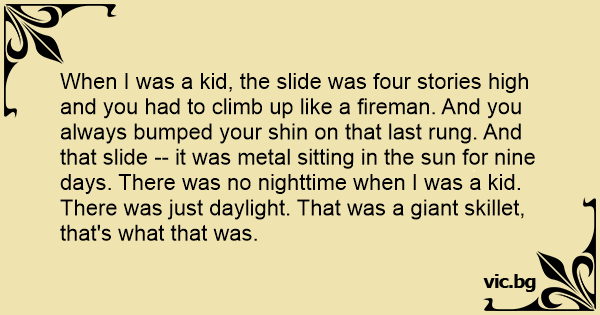 When I was a kid, the slide was four stories high and you had to climb up like a fireman. And you always bumped your shin on that last rung. And that slide -- it was metal sitting in the sun for nine days. There was no nighttime when I was a kid. There was just daylight. That was a giant skillet, that's what that was.