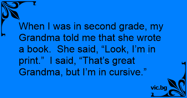 When I was in second grade, my Grandma told me that she wrote a book. She said, “Look, I’m in print.” I said, “That’s great Grandma, but I’m in cursive.”