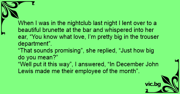 When I was in the nightclub last night I lent over to a beautiful brunette at the bar and whispered into her ear, “You know what love, I’m pretty big in the trouser department”.