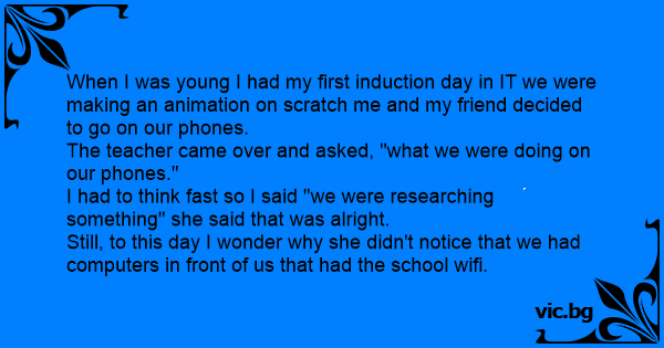 When I was young I had my first induction day in IT we were making an animation on scratch me and my friend decided to go on our phones.