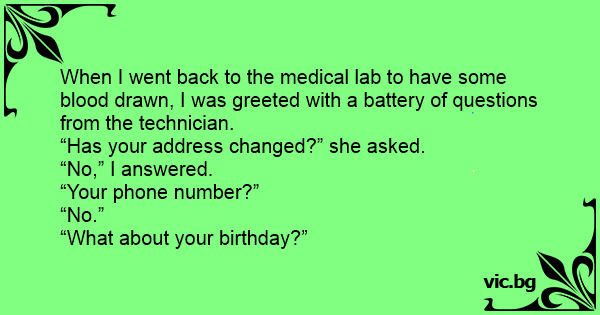 When I went back to the medical lab to have some blood drawn, I was greeted with a battery of questions from the technician.