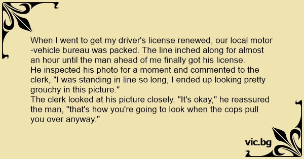 The clerk looked at his picture closely. "It's okay," he reassured the man, "that's how you're going to look when the cops pull you over anyway."