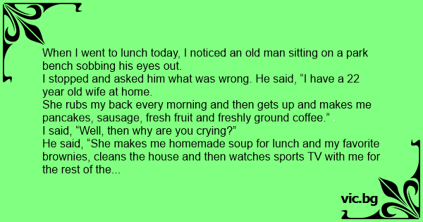 Parkā uz soliņa sēž vecs vīrs un ļoti raud. Pienāk viņam klāt garāmgājējs un jautā: - Kāpēc vecīt Tu raudi? - Dēliņ, man ir 88 gadi, divas nedēļas atpakaļ apprecējos ar visskaistāko meiteni...