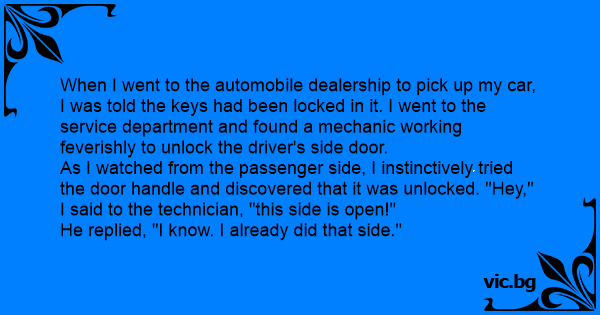 When I went to the automobile dealership to pick up my car, I was told the keys had been locked in it. I went to the service department and found a mechanic working feverishly to unlock the driver's side door.