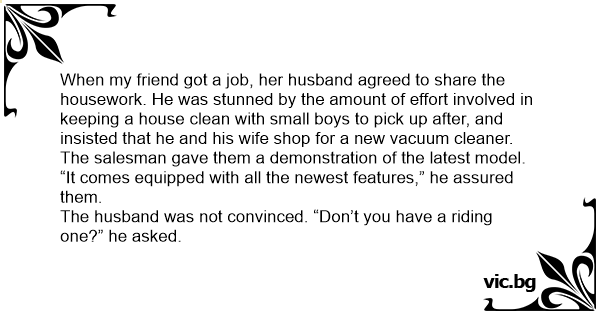 When my friend got a job, her husband agreed to share the housework. He was stunned by the amount of effort involved in keeping a house clean with small boys to pick up after, and insisted that he and his wife shop for a new vacuum cleaner.