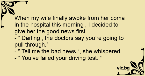 When my wife finally awoke from her coma in the hospital this morning , I decided to give her the good news first.