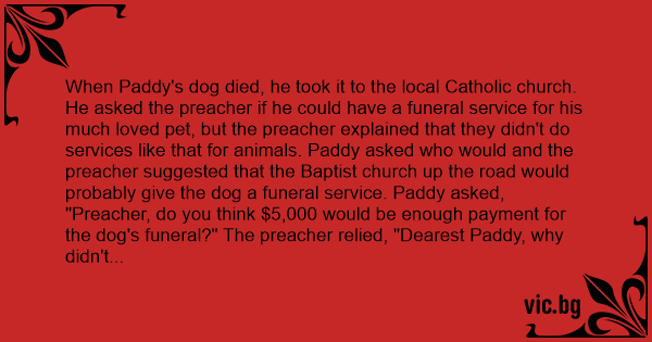 When Раddy's dog died, he took it to the local Catholic church. He asked the preacher if he could have a funeral service for his much loved pet, but the preacher explained that they didn't do services like that for animals. Раddy asked who would and the preacher suggested that the Baptist church up the road would probably give the dog a funeral service. Раddy asked,