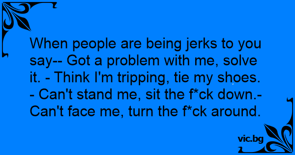 When people are being jerks to you say-- Got a problem with me, solve it. - Think I'm tripping, tie my shoes. - Can't stand me, sit the fuск down.- Can't face me, turn the fuск around.