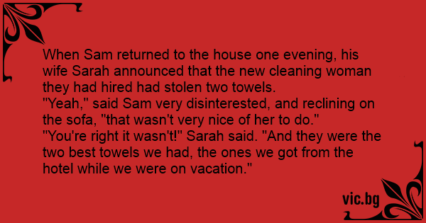 When Sam returned to the house one evening, his wife Sarah announced that the new cleaning woman they had hired had stolen two towels.