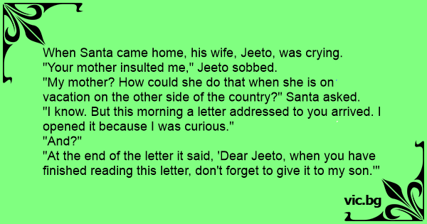 When Santa came home, his wife, Jeeto, was crying.