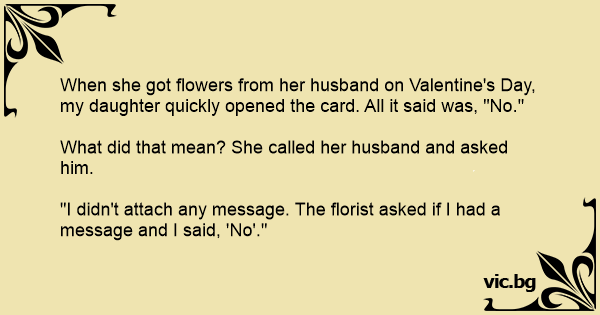When she got flowers from her husband on Valentine's Day, my daughter quickly opened the card. All it said was, "No."