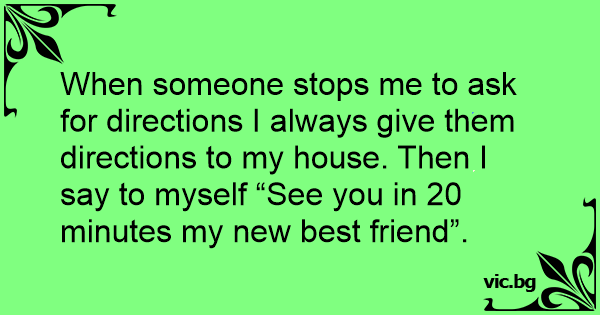 When someone stops me to ask for directions I always give them directions to my house. Then I say to myself “See you in 20 minutes my new best friend”.