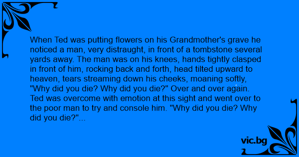 When Ted was putting flowers on his Grandmother's grave he noticed a man, very distraught, in front of a tombstone several yards away. The man was on his knees, hands tightly clasped in front of him, rocking back and forth, head tilted upward to heaven, tears streaming down his cheeks, moaning softly, "Why did you die? Why did you die?" Over and over again.