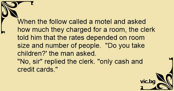 When the follow called a motel and asked how much they charged for a room, the clerk told him that the rates depended on room size and number of people. "Do you take children?' the man asked.