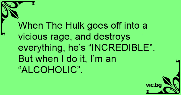 When The Hulk goes off into a vicious rage, and destroys everything, he’s “INCREDIBLE”. But when I do it, I’m an “ALCOHOLIC”.
