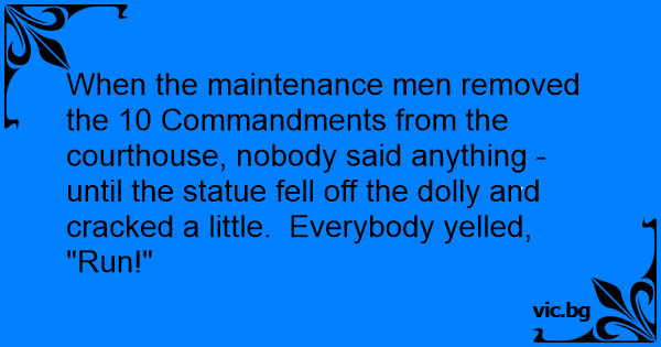 When the maintenance men removed the 10 Commandments from the courthouse, nobody said anything - until the statue fell off the dolly and cracked a little. Everybody yelled, "Run!"
