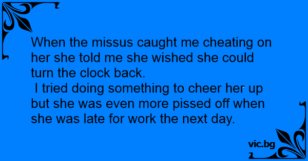 When the missus caught me cheating on her she told me she wished she could turn the clock back.