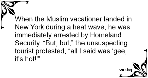 When the Muslim vacationer landed in New York during a heat wave, he was immediately arrested by Homeland Security. “But, but,” the unsuspecting tourist protested, “all I said was ‘gee, it's hot!‘”